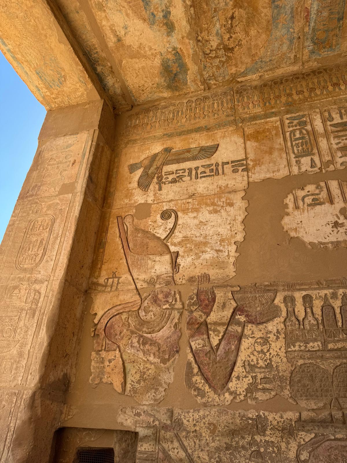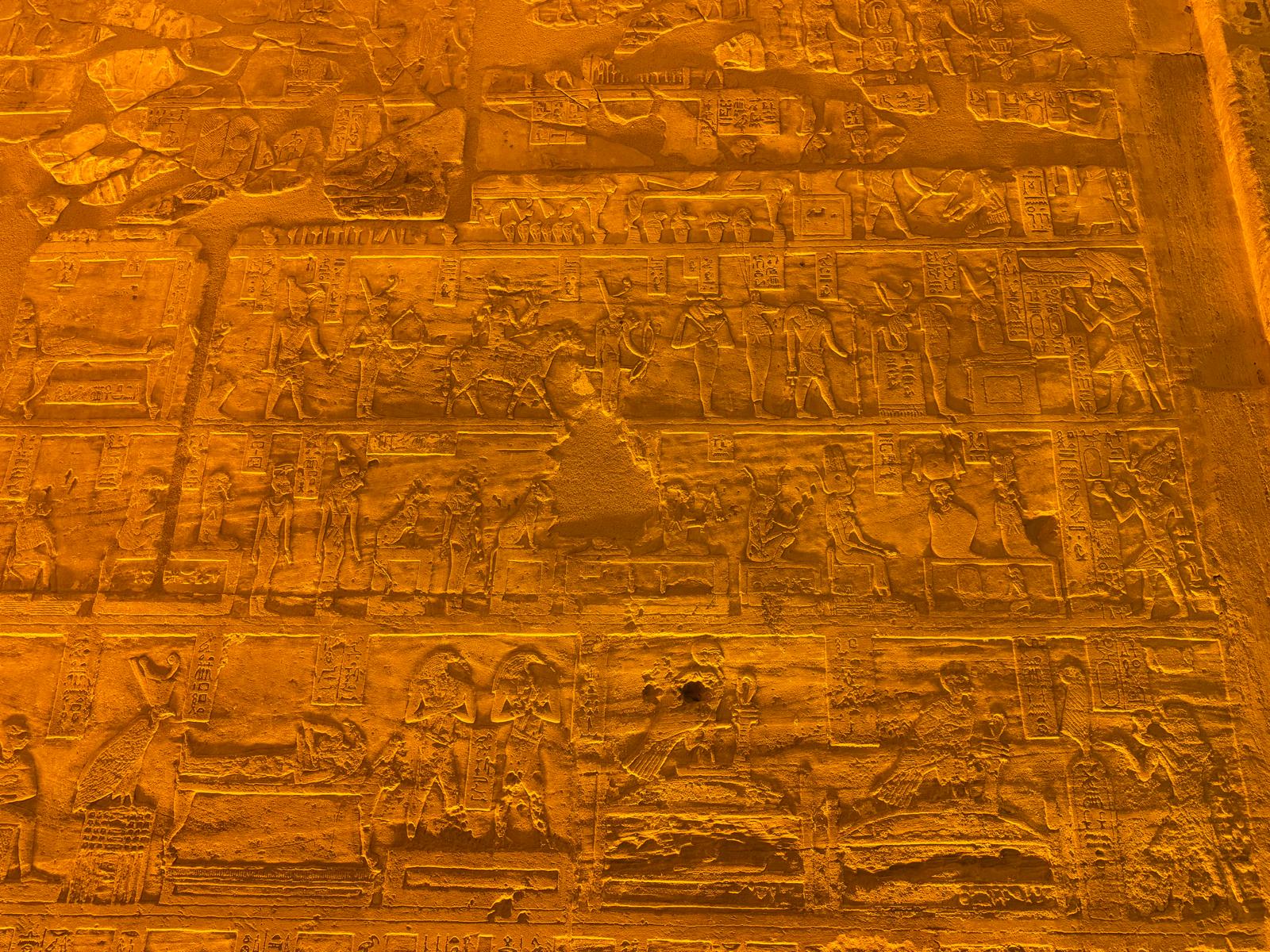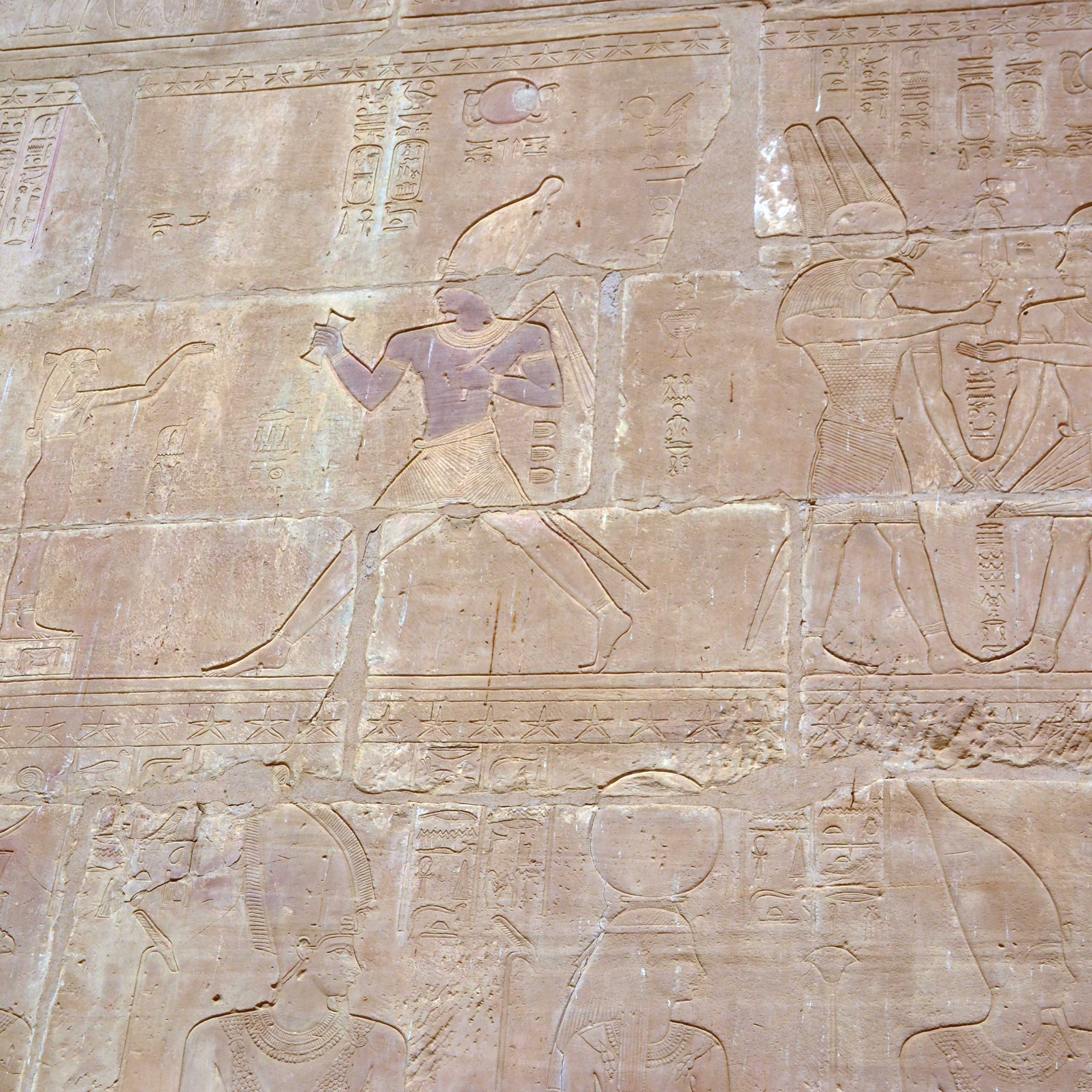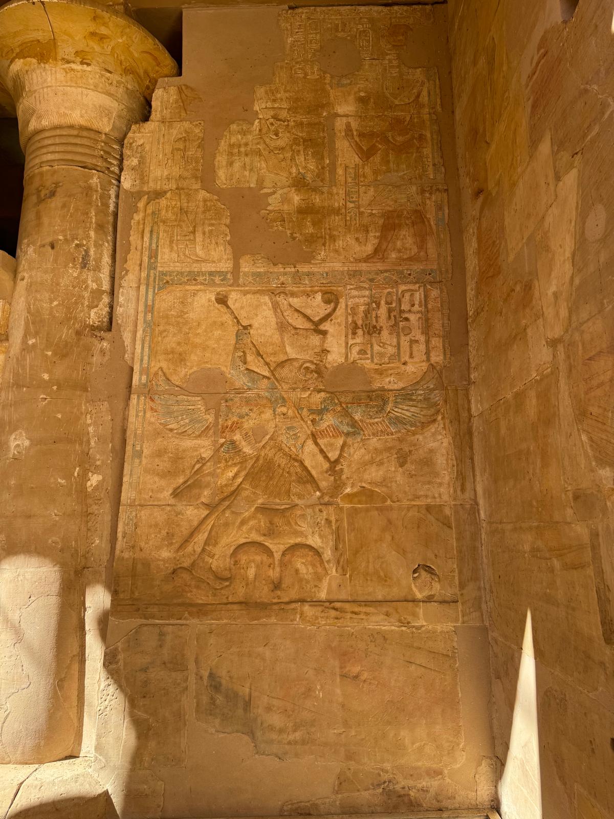 Other notable reliefs of the temple include previously unprecedented representations of approximately 700 gods from throughout Egypt in the sanctuary (fig. 9). The 700 deities are grouped geographically, demonstrating a detailed knowledge of Egyptian religion by either the artists, temple commissioners, or both, and overwhelmingly represent the deities of Upper Egypt, with those of Lower Egypt being mostly excluded. Inside the Temple of Darius, there is a large scene depicting a falcon-headed Seth spearing Apophis (fig. 10).