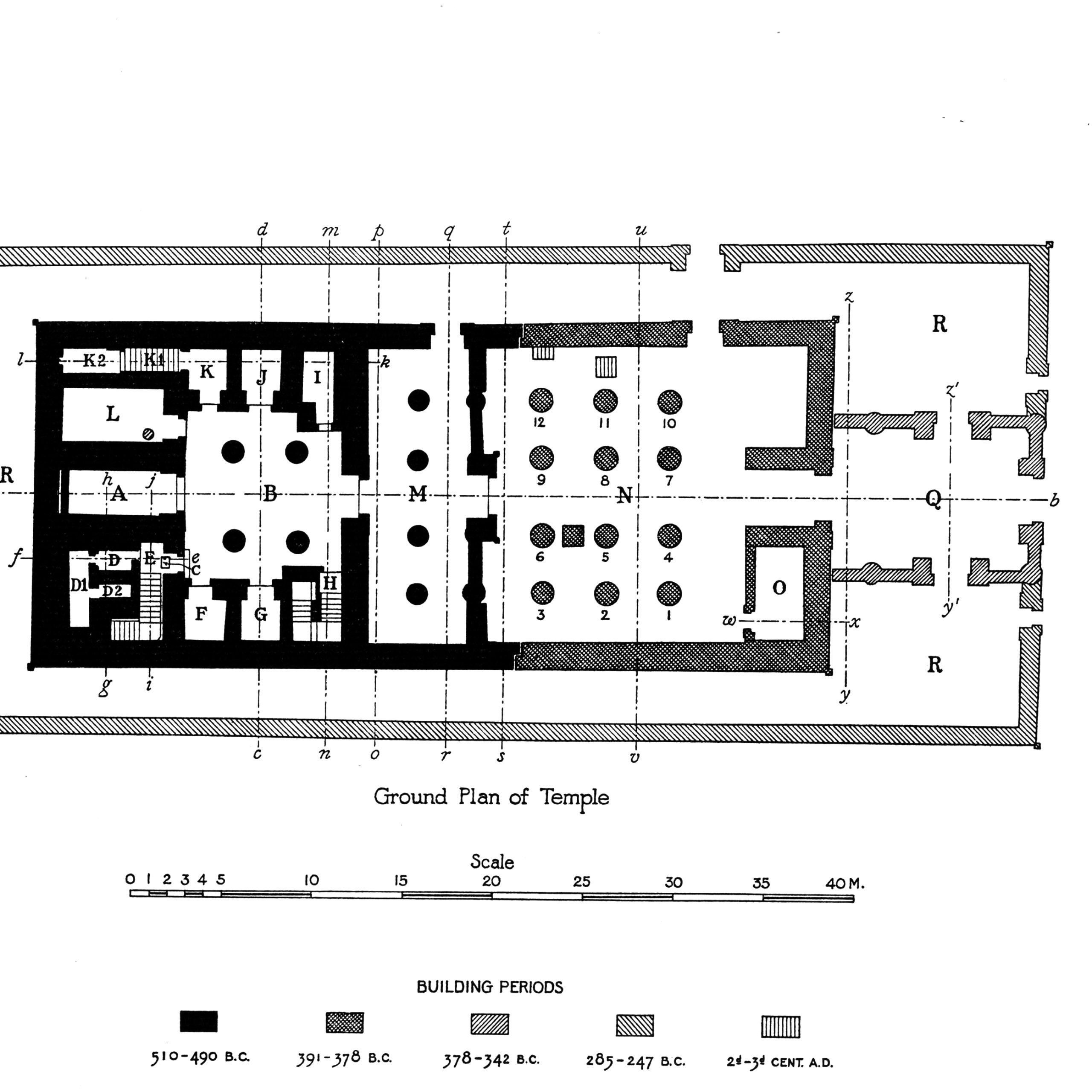 The entire front width of the temple built under Darius I was taken up by columned hall M, which at the time served as an entrance porch. It originally featured two rows of columns, one forming a screen that temporarily served as the temple’s façade, and another set positioned inside. The walls bear decorations featuring scenes that depict Darius offering gifts to, and receiving greetings from, various deities (fig. 5).