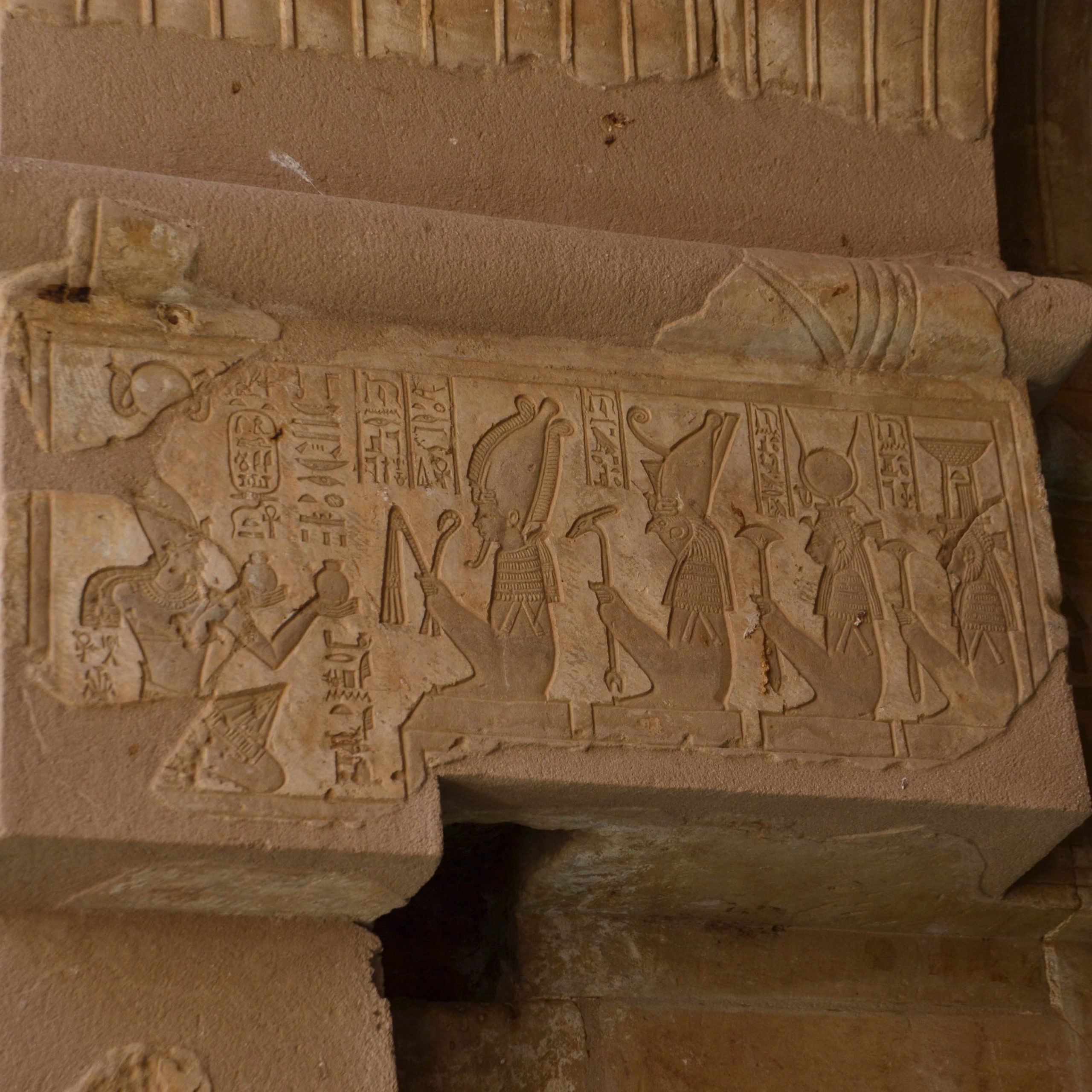 Fig. 5. Darius, kneeling, offers wine to Osiris, Horus Son of Isis, Isis, and Nephthys. South reveal of the gateway to Darius’ Temple (image: R. Röllinger).